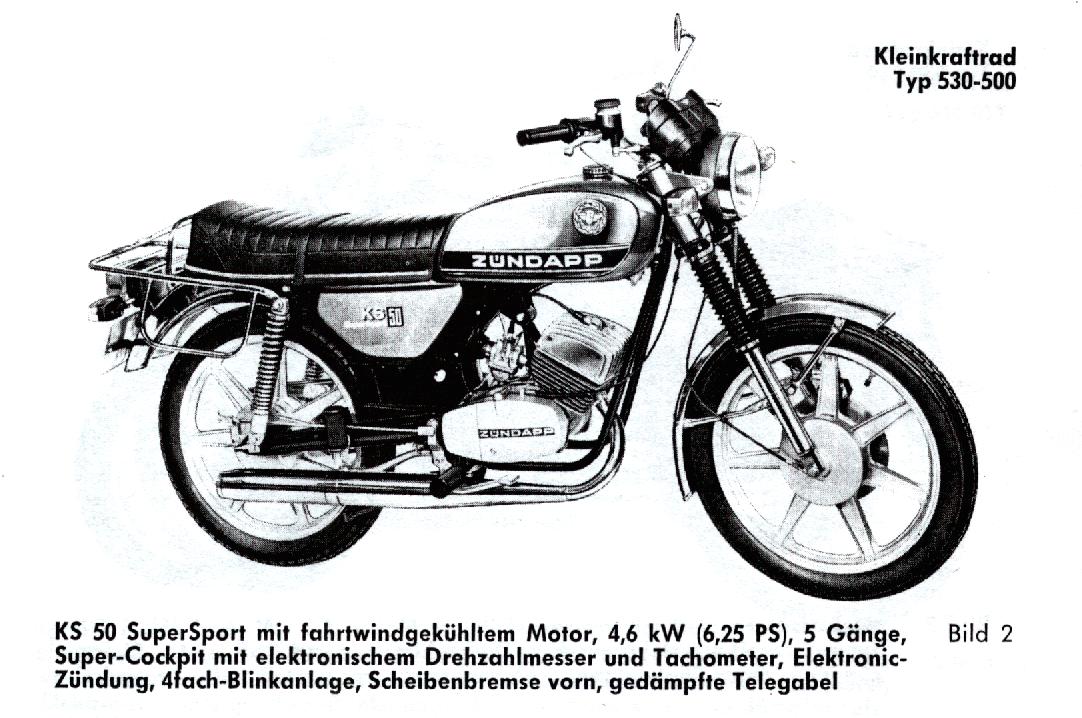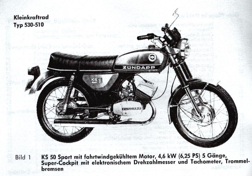 Die KS 50 Sport ist das einzige Modell mit Bosch Schwunglicht-Magnetzünder (6V/25-4/5W) und außenliegender Zündspule. Speichenfelgen mit Trommelbremsen. Keine Blinkanlage